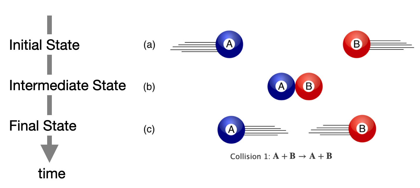 Think billiard balls. \[ \mathbf{A}+\mathbf{B}\to \mathbf{A}+\mathbf{B} \nonumber \tag{4.3}\]