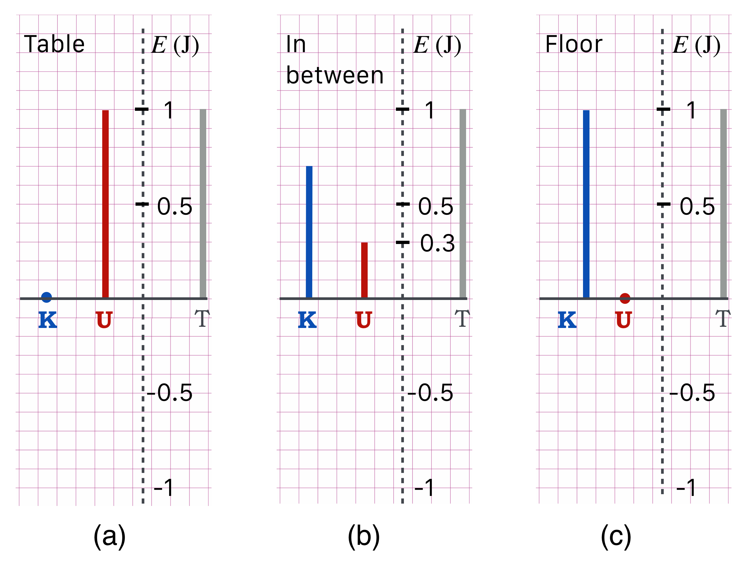 • The only energy that the apple has is all potential and so the total energy of that system is always going to be equal to 1 J and so the total energy is indicated on the right of (a) as \(T=1\) J (for \(E_T\), “total”).