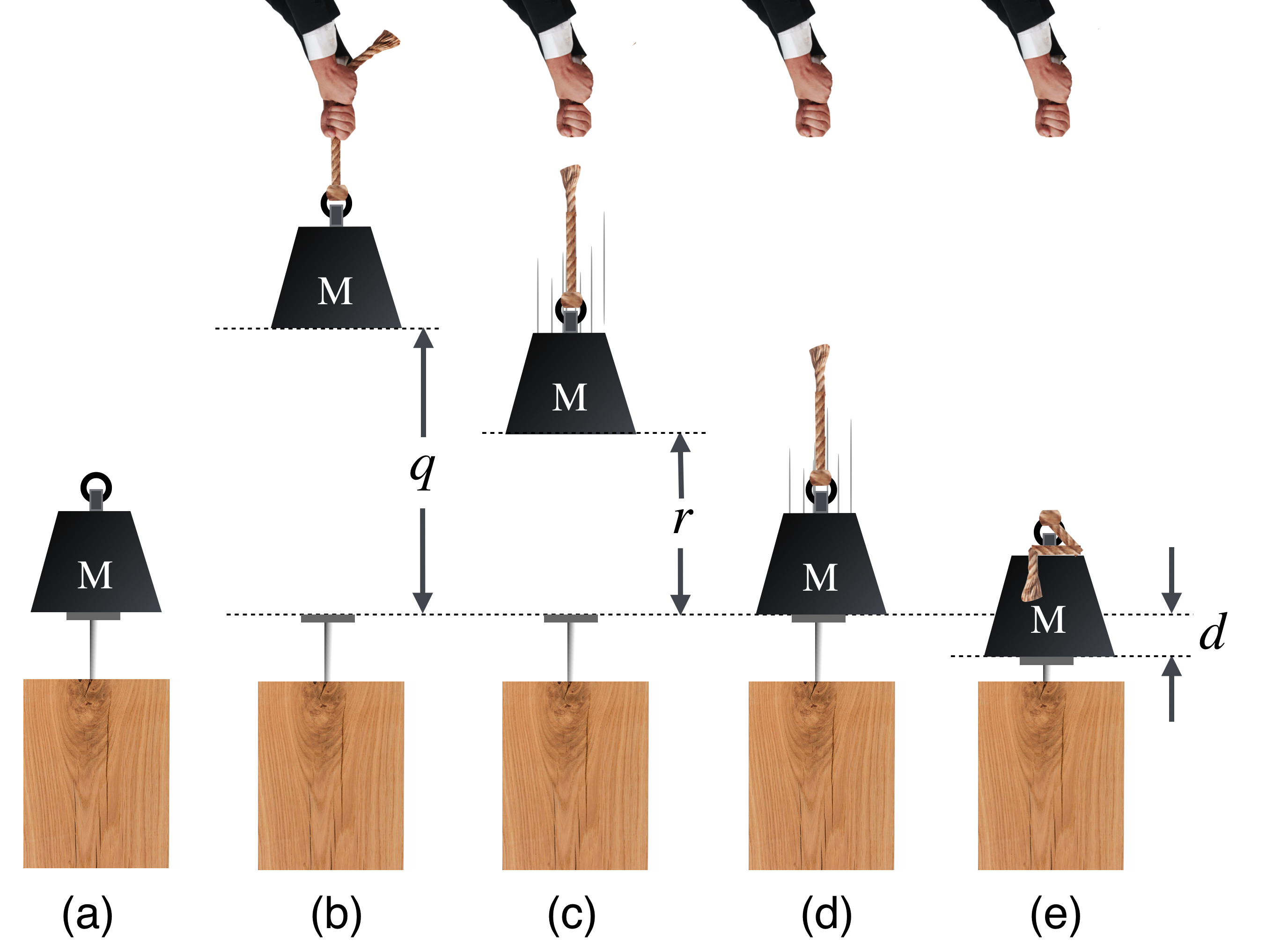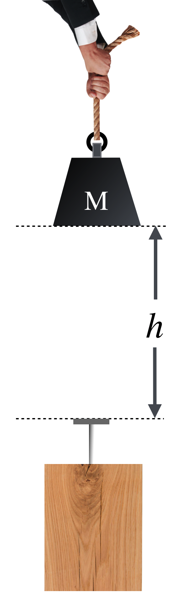 • (e): Work has been done by \(M\) on the wood and a force has been applied through a distance \(d\) until it stops and all of the lost kinetic energy has warmed the wood and the nail. The work done is equal to the change in \(K\) which is \(K-K_0\) but since \(K=0\) once the nail stops, the work done on the wood is numerically equal to the kinetic energy that \(M\) had just before it touches the nail at (d).
