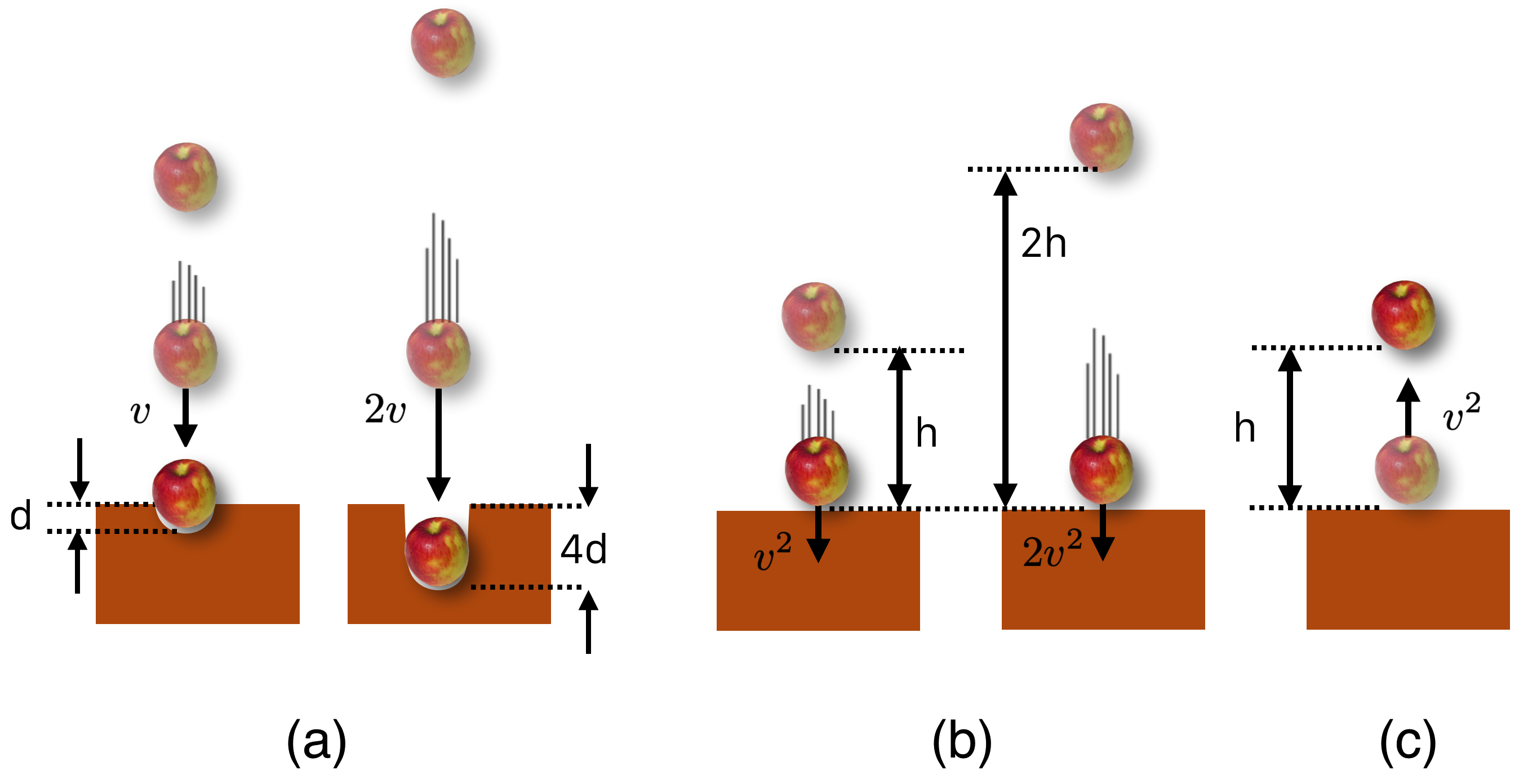 Figure 5.4: The above list in figures. (a) shows that the higher the fall, the deeper the indentation by the square of the distance. (b) shows that the higher the drop, the faster an object goes by the square of the velocity. And, (c) shows that a ball will return to the original height if shot from below at the speed it would have fallen.