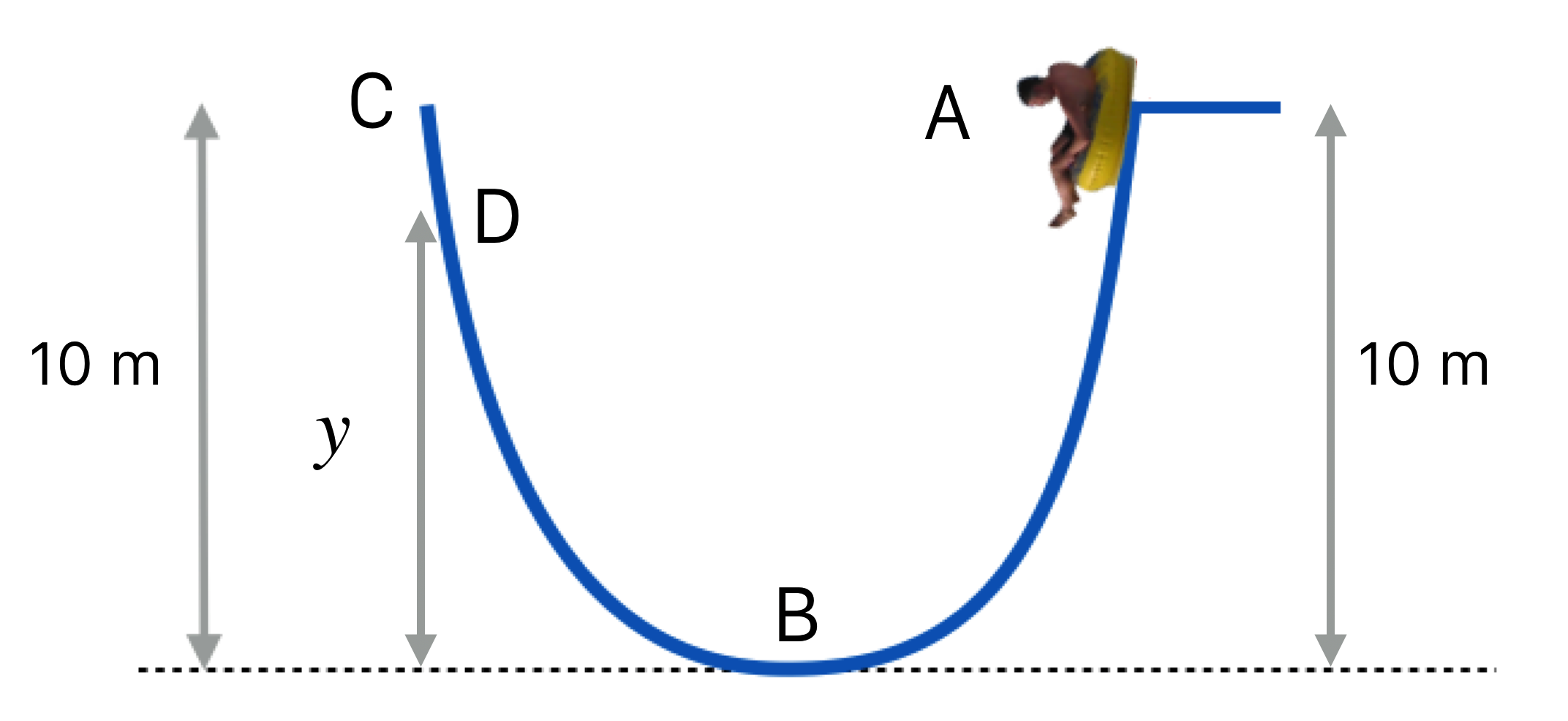 For a 90 kg person starting from rest at point A (h = 10 m):